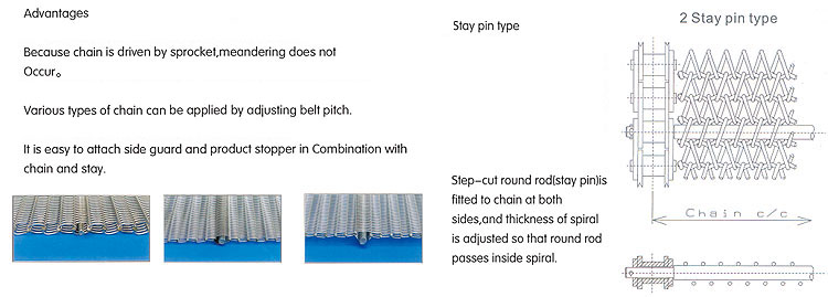 Chain with atachment is used.Flat bar is fitted to attachment at both sides.Flat barIs passed inside spiral(as with stay pin type)or belt is put on flat bar.Spacer must Be provided between attachment base and flat bar so that belt is positioned at same  Level as chain center.